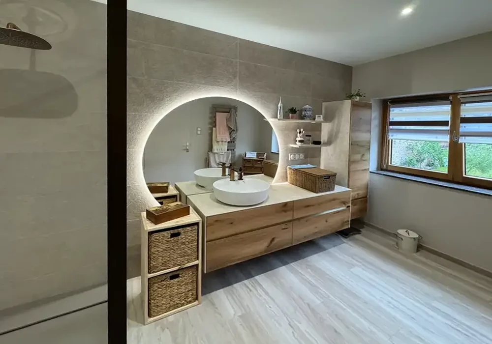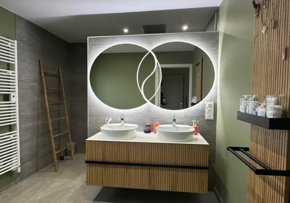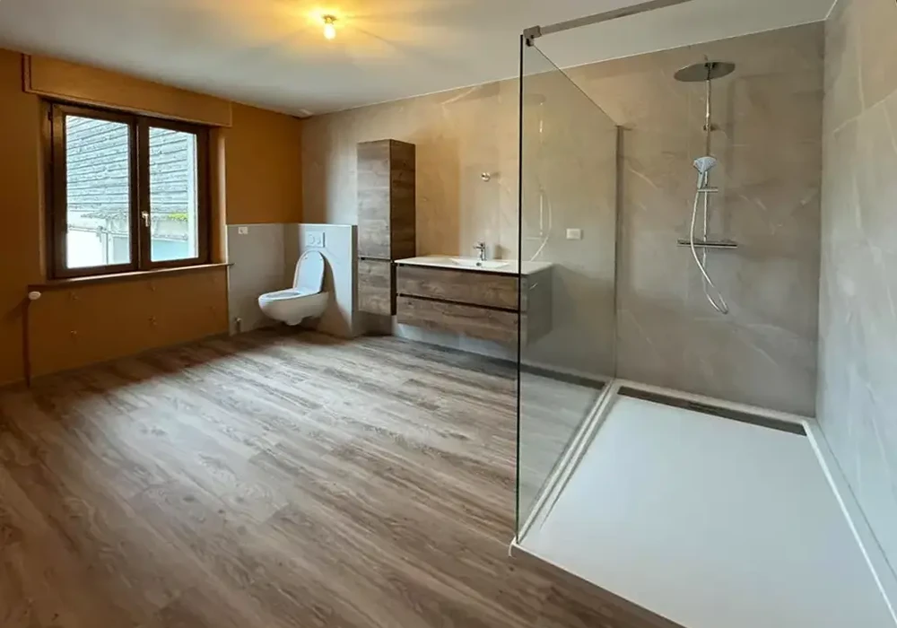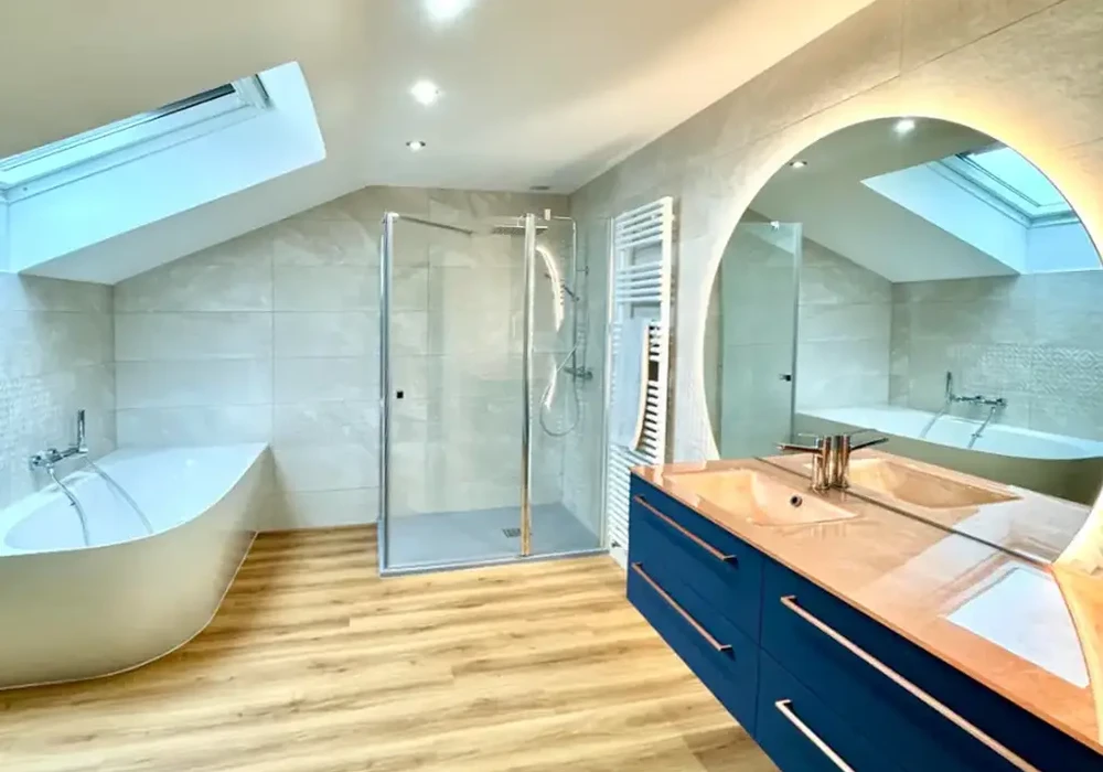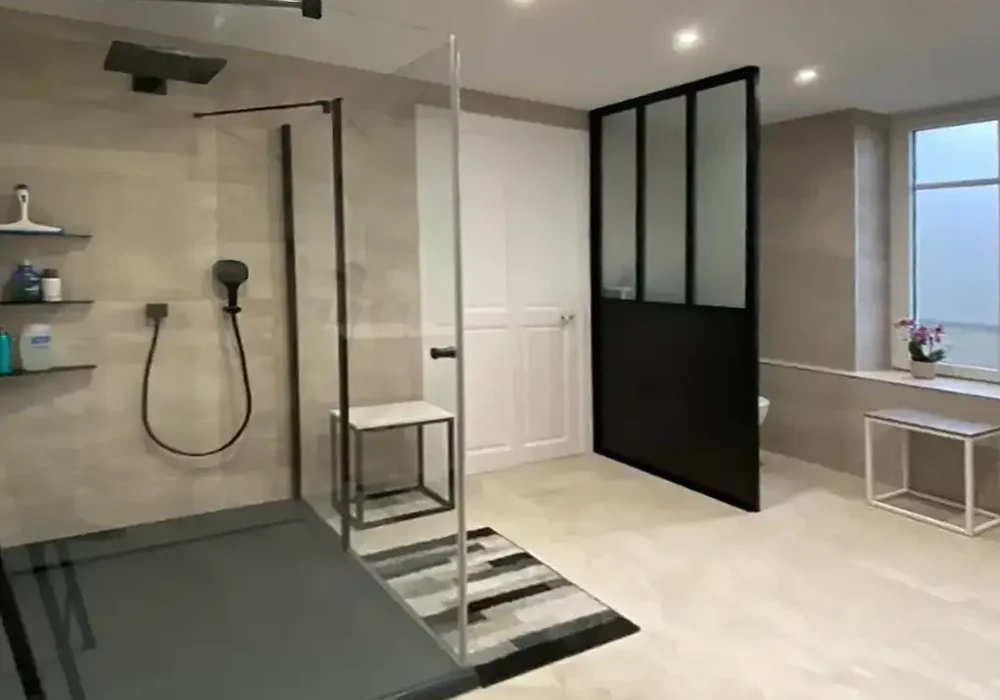 L'aménagement intégral suit un processus précis. Nous commençons par un diagnostic détaillé de votre espace, suivi du démontage des éléments existants puis de la préparation des supports. Nous procédons ensuite à l'agencement du réseau hydraulique, incluant la mise en place des évacuations, des alimentations. Une étape fondamentale concerne l'étanchéité des zones humides, réalisée selon les normes en vigueur (SPEC ou SEL) avant la pose des revêtements. Nous effectuons les travaux électriques conformément à la norme NF C 15-100 pour les locaux humides. Nous intégrons par la suite les dispositifs de ventilation nécessaires avant le montage des équipements (douche, baignoire, WC, vasque) et leur raccordement au réseau. Suite à la vérification de l'étanchéité, nous finalisons les habillages techniques. Un contrôle fonctionnel confirme la performance de tous les composants préalablement à la réception.